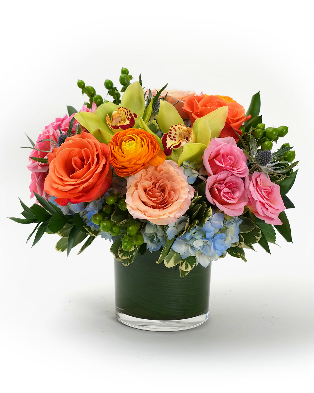 This delightful collection of Harvest, Harvest Moon, Harvest Full Moon, Harvest Moon Centerpiece and Moondance is full of Blue Hydrangea, Orange Roses, Eryngium Thistle, PInk Spray Roses, Orange Ranunculus and Cymbidium Orchid.