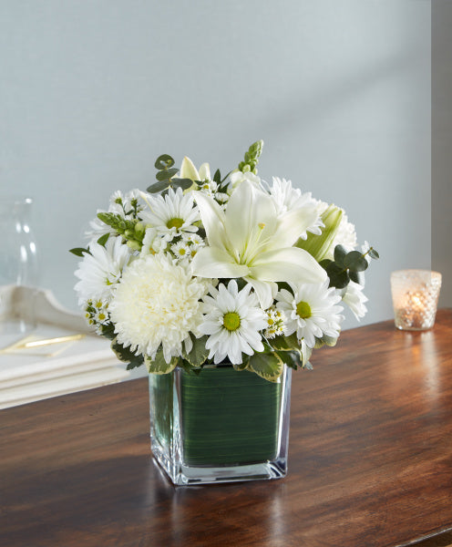 • Elegant white ranunculus arranged with lush greens, perfect for weddings and special occasions.