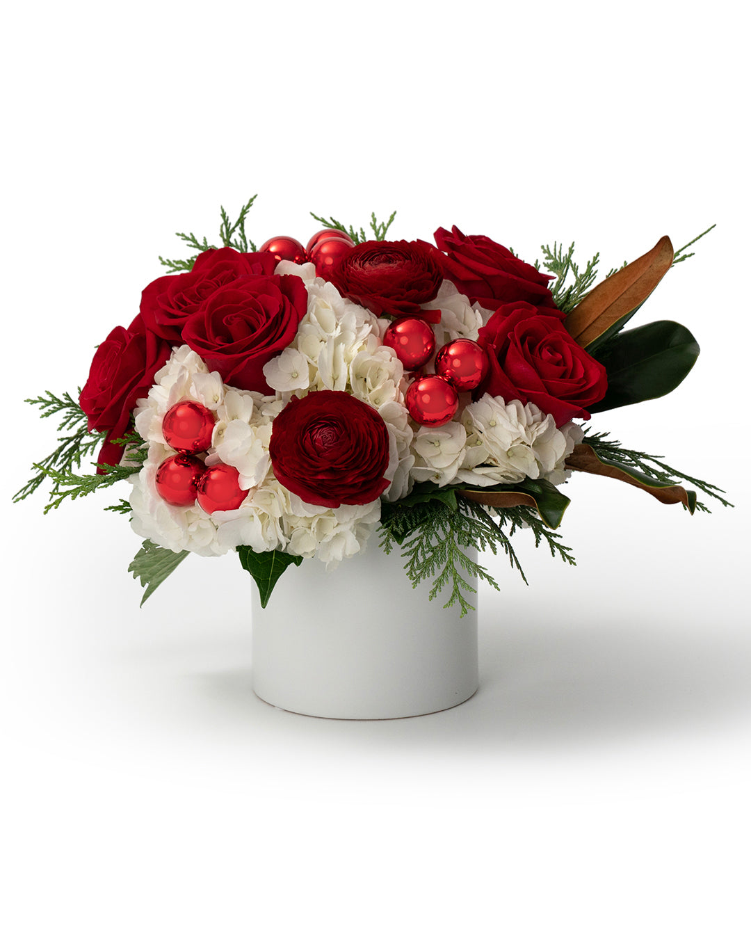 The perfect little kiss of Christmas we call Peppermint Kiss. Roses, Hydrangeas, Ornaments, Pine and more. What's not to love?